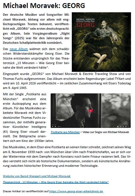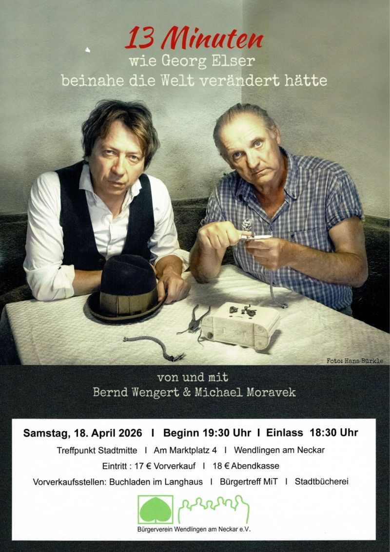 16.02.2026 Aktuelles: Wendlinger Kulturzeit "13 MINUTEN – wie Georg Elser beinahe die Welt verändert hätte" 18.04.2026
