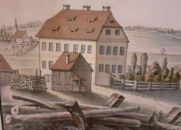 Abb. 3: Der Schwanen um 1810. Vor der Gastwirtschaft befindet sich das Brunnenhaus, ganz links kleiner Teil der Scheune. Hinter dem Gebäude erkennt man den (Gemüse-)Garten. Im Vordergrund Teile des Holzlagers. Links im Hintergrund die Kapelle im Hürnholz, rechts ein nicht mehr lokalisierbares Sühnekreuz.