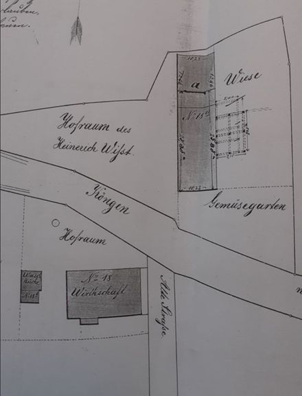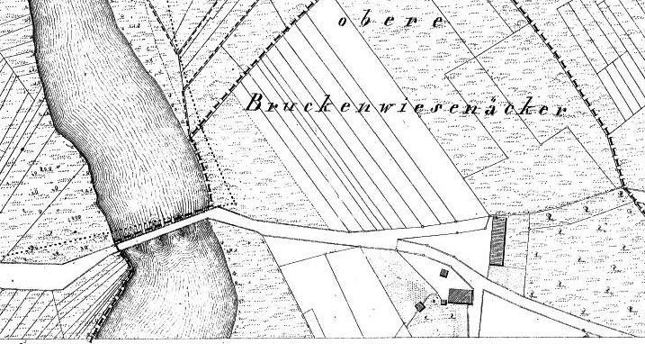 Abb. 4a,b: Ausschnitt aus der Urkarte, ca. 1828 und der daraus entwickelten Flurkarte von 1830.Zu sehen ist links die Ulrichsbrücke, Der Schwanen ist das Gebäude unterhalb der Straße, darüber die Scheune und das Brunnenhaus.