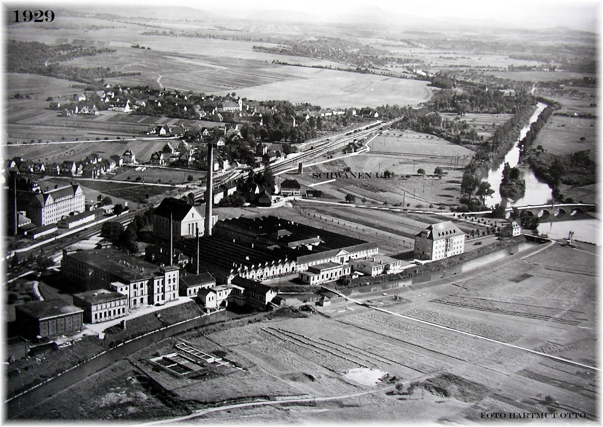 Abb. 8: Blick aus der Vogelperspektive von 1929. Der Schwanen im Mittelpunkt, davor die Firma Otto, links die Firma Behr. Dahinter der Ort Unterboihingen (Foto Archiv HOS).