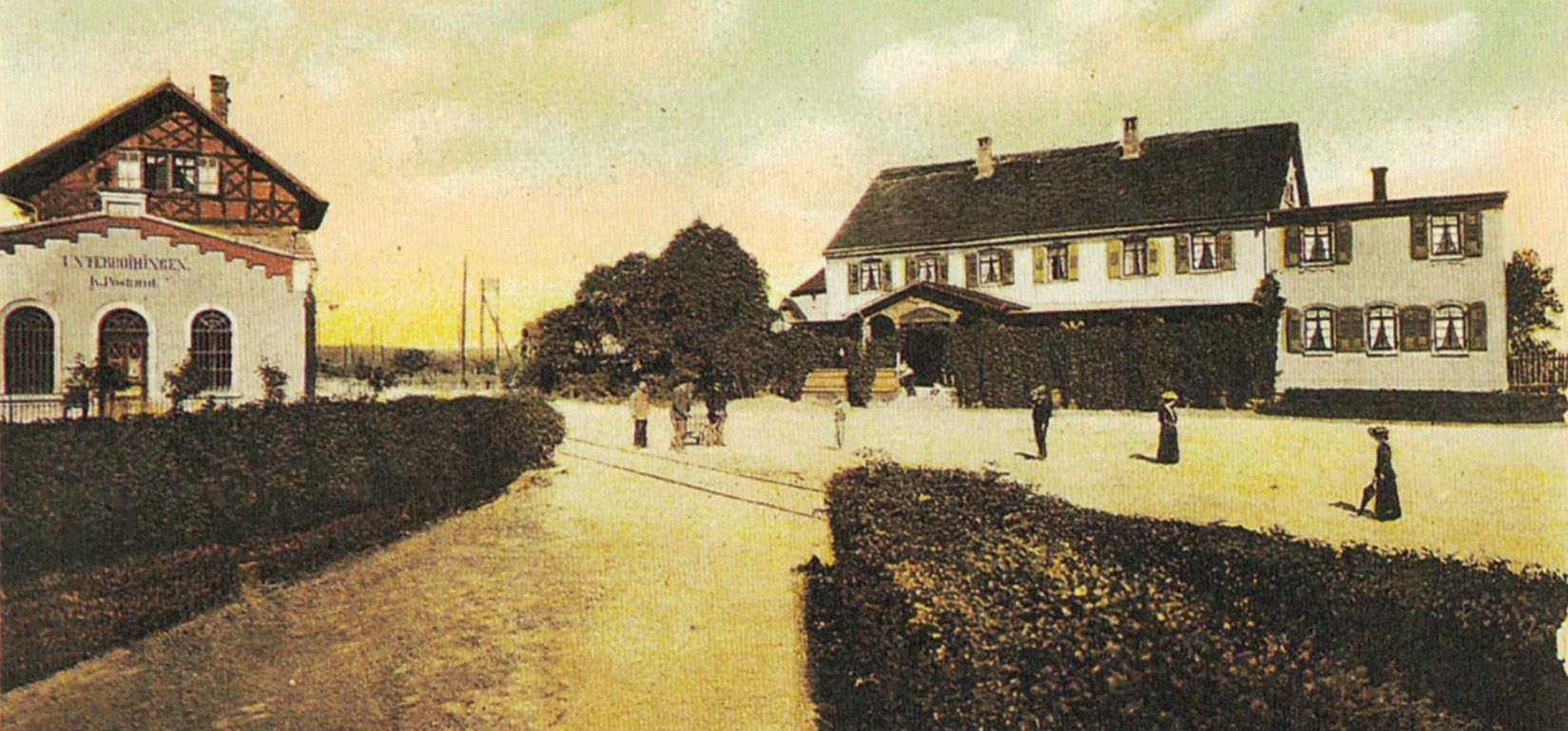 Abb. 1: Bahnhof, Poststation (links) und Hotel Keim (rechts). Foto aus dem Jahr 1905. Das Bahngleis im Vordergrund führte zum Güterschuppen. Aus HERGENRÖDER, 1992.