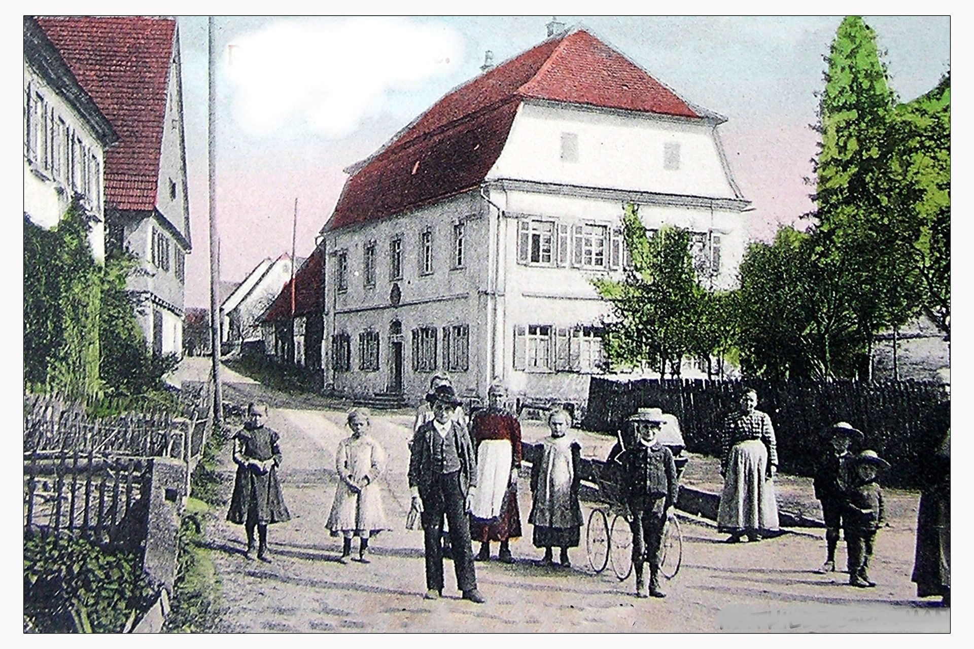 Abb. 1: Das ehemalige Pfarrhaus aus dem Jahr 1754, von Sankt Kolumban ausgesehen. Dahinter die Drittel- und Pfarrscheuer. Links der ehemalige Keimen- oder Bartenbacher Hof, danach der ehemalige Widdumhof (Beschreibung bei Station 8). Aufnahme ca. 1900. Stadtarchiv Wendlingen am Neckar.